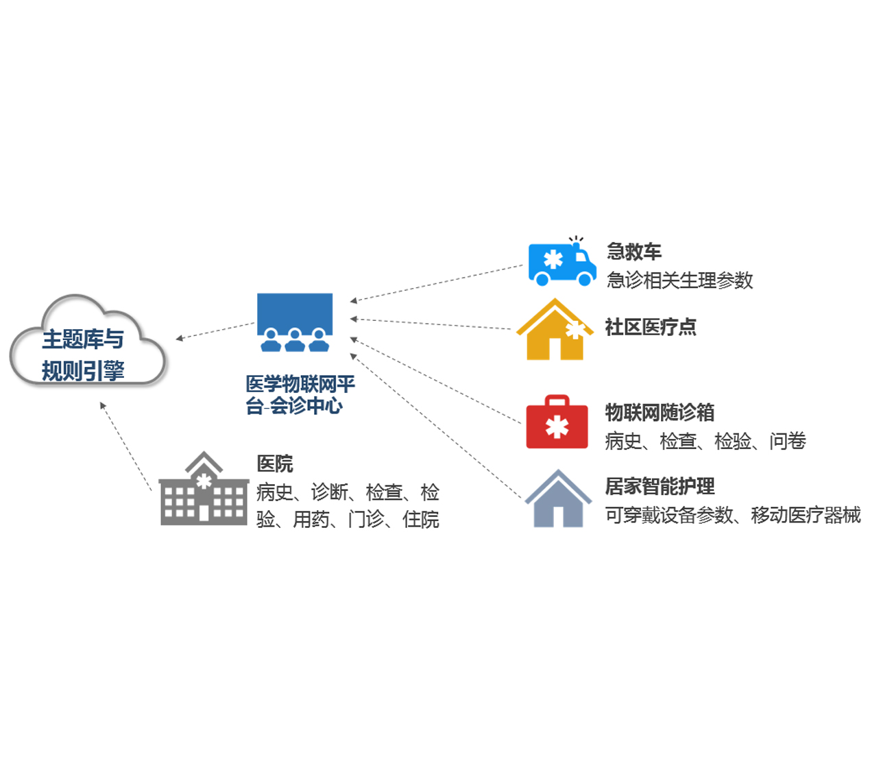 金橋健康管理系統是一套全程健康管理系統,實(shí)現診前,診中,診后全程健康管理。使用早期風(fēng)險篩查和模型評估實(shí)現診前,用藥跟蹤和診斷管理實(shí)現診中管理,健康干預和遠程隨訪(fǎng)實(shí)現診后管理。系統形成了三個(gè)應用平臺,即健康管理平臺、居家物聯(lián)網(wǎng)平臺、應急保障平臺。健康管理平臺基于醫療大數據的分析與決策,實(shí)現診前診中的評估和診療,物聯(lián)網(wǎng)平臺主要功能為居家信息采集以及健康管理對象的干預隨訪(fǎng)。應急保障平臺應用5G信息傳輸技術(shù)和數據可視化幫助專(zhuān)家遠程指揮,為搶救應急病人提供實(shí)時(shí)決策。